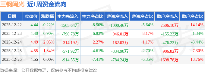 沪深股通持股方面,截止2025年12月26日收盘,三钢闽光深股通持股数为1311.4万股,占流通股比为54.0%。