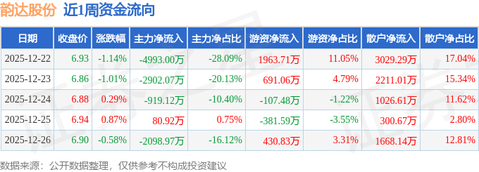 资金流向数据方面,本周韵达股份主力资金合计净流出1.08亿元,游资资金合计净流入2596.52万元,散户资金合计净流入8235.73万元。本周资金流向一览见下表: