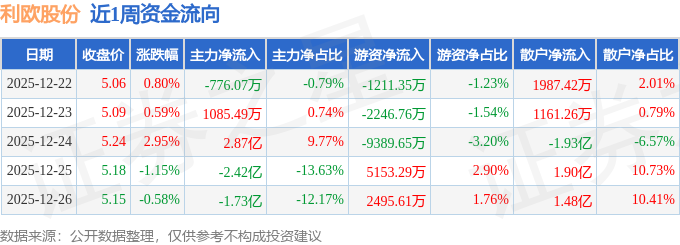 资金流向数据方面,本周利欧股份主力资金合计净流出1.25亿元,游资资金合计净流出5198.85万元,散户资金合计净流入1.77亿元。本周资金流向一览见下表: