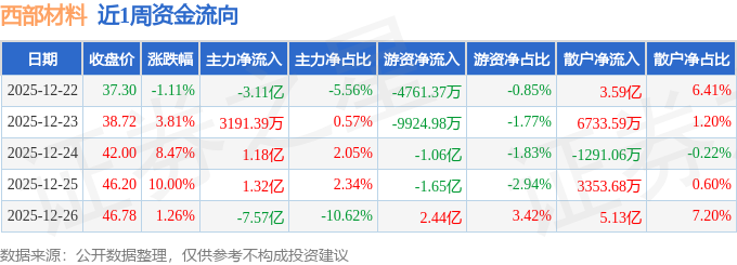 资金流向数据方面,本周西部材料主力资金合计净流出7.86亿元,游资资金合计净流出1.74亿元,散户资金合计净流入9.6亿元。本周资金流向一览见下表: