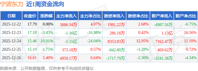 资金流向数据方面,本周宁波东力主力资金合计净流出1.88亿元,游资资金合计净流入8060.64万元,散户资金合计净流入1.07亿元。本周资金流向一览见下表: