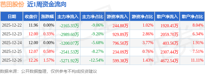 沪深股通持股方面,截止2025年12月26日收盘,芭田股份深股通持股数为540.55万股,占流通股比为76.0%。