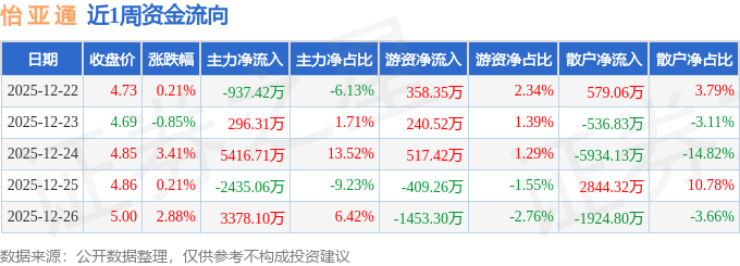 资金流向数据方面,本周怡 亚 通主力资金合计净流入5718.64万元,游资资金合计净流出746.26万元,散户资金合计净流出4972.38万元。本周资金流向一览见下表: