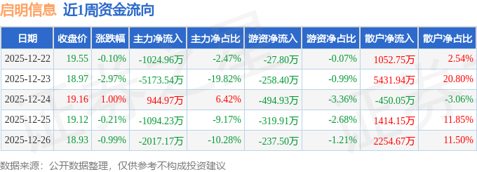 资金流向数据方面,本周启明信息主力资金合计净流出8364.92万元,游资资金合计净流出1338.54万元,散户资金合计净流入9703.46万元。本周资金流向一览见下表:
