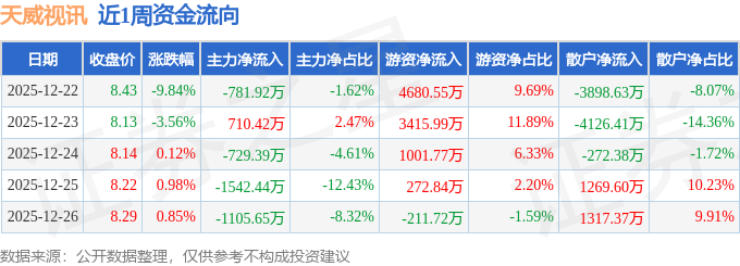 沪深股通持股方面,截止2025年12月26日收盘,天威视讯深股通持股数为1126.31万股,占流通股比为140.0%。
