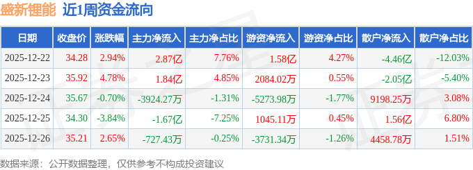 资金流向数据方面,本周盛新锂能主力资金合计净流入2.58亿元,游资资金合计净流入9951.03万元,散户资金合计净流出3.57亿元。本周资金流向一览见下表: