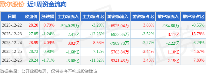 沪深股通持股方面,截止2025年12月26日收盘,歌尔股份深股通持股数为2.42亿股,占流通股比为806.0%。