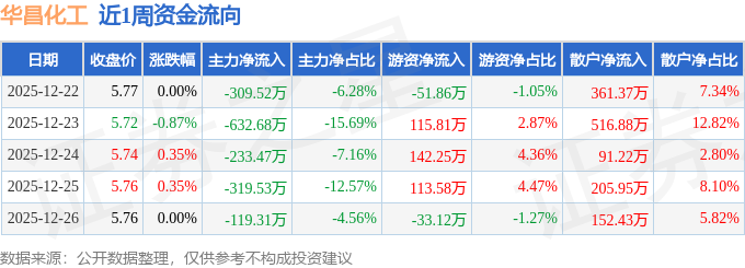 资金流向数据方面,本周华昌化工主力资金合计净流出1614.52万元,游资资金合计净流入286.66万元,散户资金合计净流入1327.85万元。本周资金流向一览见下表: