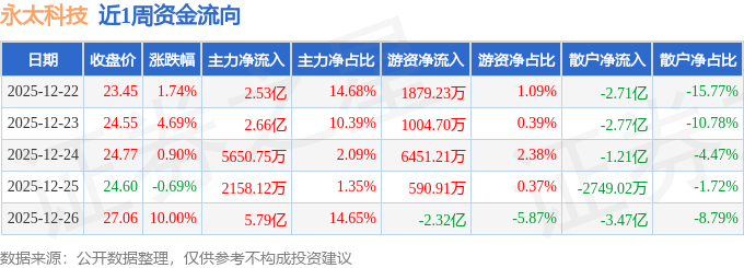 资金流向数据方面,本周永太科技主力资金合计净流入11.76亿元,游资资金合计净流出1.32亿元,散户资金合计净流出10.43亿元。本周资金流向一览见下表: