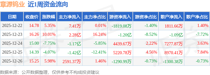 资金流向数据方面,本周章源钨业主力资金合计净流出489.24万元,游资资金合计净流出5418.31万元,散户资金合计净流入5907.55万元。本周资金流向一览见下表: