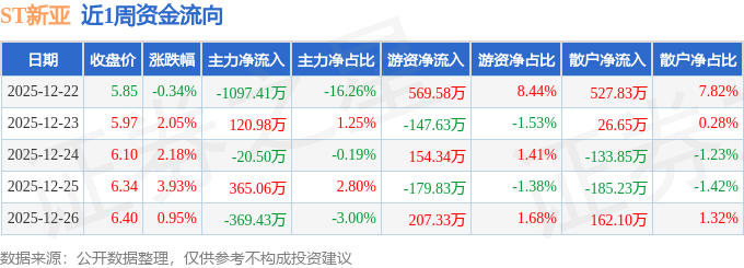 资金流向数据方面,本周ST新亚主力资金合计净流出1001.3万元,游资资金合计净流入603.8万元,散户资金合计净流入397.49万元。本周资金流向一览见下表: