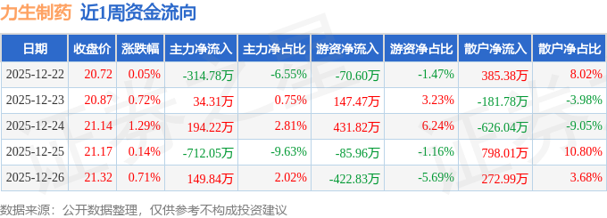 资金流向数据方面,本周力生制药主力资金合计净流出648.45万元,游资资金合计净流出0.1万元,散户资金合计净流入648.55万元。本周资金流向一览见下表: