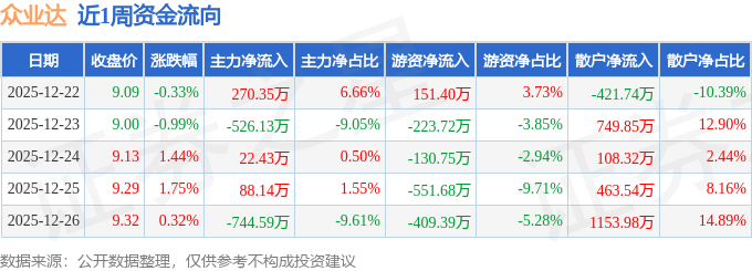 资金流向数据方面,本周众业达主力资金合计净流出889.8万元,游资资金合计净流出1164.14万元,散户资金合计净流入2053.94万元。本周资金流向一览见下表: