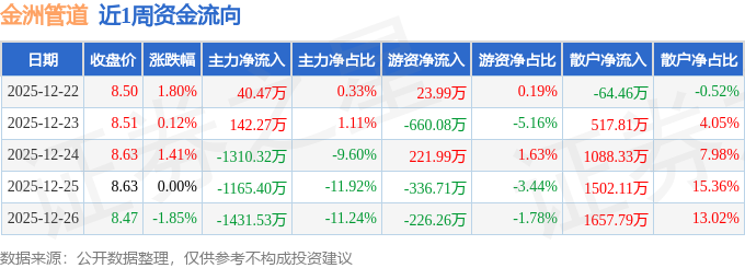 资金流向数据方面,本周金洲管道主力资金合计净流出3724.51万元,游资资金合计净流出977.07万元,散户资金合计净流入4701.58万元。本周资金流向一览见下表: