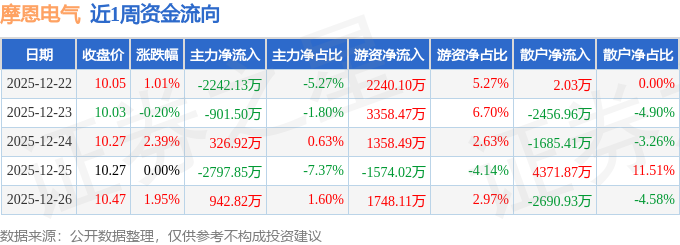 资金流向数据方面,本周摩恩电气主力资金合计净流出4671.74万元,游资资金合计净流入7131.15万元,散户资金合计净流出2459.4万元。本周资金流向一览见下表: