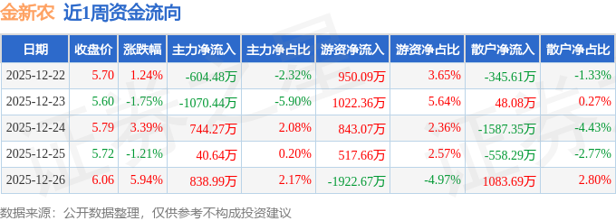 资金流向数据方面,本周金新农主力资金合计净流出51.02万元,游资资金合计净流入1410.51万元,散户资金合计净流出1359.49万元。本周资金流向一览见下表: