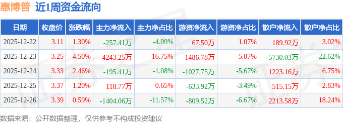 资金流向数据方面,本周惠博普主力资金合计净流入2505.14万元,游资资金合计净流出916.91万元,散户资金合计净流出1588.23万元。本周资金流向一览见下表: