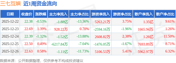 资金流向数据方面,本周三七互娱主力资金合计净流出5.03亿元,游资资金合计净流入8908.35万元,散户资金合计净流入4.14亿元。本周资金流向一览见下表: