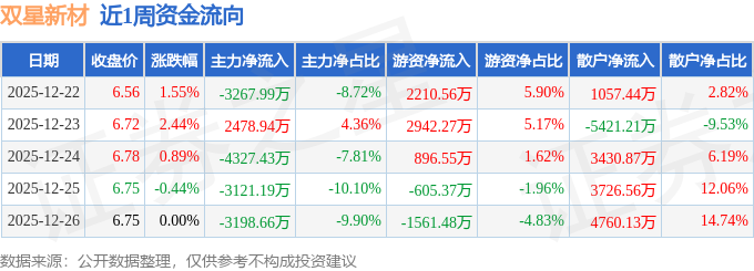 资金流向数据方面,本周双星新材主力资金合计净流出1.14亿元,游资资金合计净流入3882.53万元,散户资金合计净流入7553.79万元。本周资金流向一览见下表: