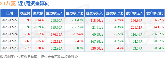资金流向数据方面,本周ST八菱主力资金合计净流出379.05万元,游资资金合计净流入205.17万元,散户资金合计净流入173.88万元。本周资金流向一览见下表: