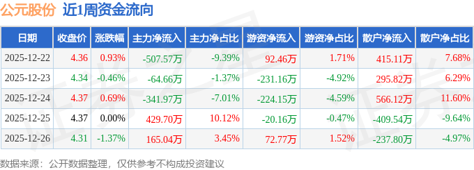 资金流向数据方面,本周公元股份主力资金合计净流出319.47万元,游资资金合计净流出310.24万元,散户资金合计净流入629.71万元。本周资金流向一览见下表: