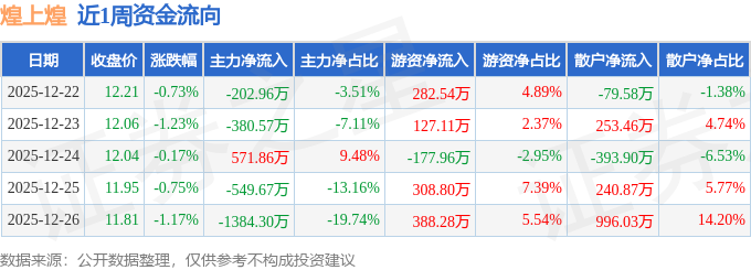 资金流向数据方面,本周煌上煌主力资金合计净流出1945.64万元,游资资金合计净流入928.76万元,散户资金合计净流入1016.88万元。本周资金流向一览见下表: