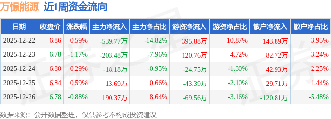 资金流向数据方面,本周万憬能源主力资金合计净流出557.36万元,游资资金合计净流入378.93万元,散户资金合计净流入178.43万元。本周资金流向一览见下表: