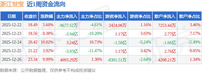 资金流向数据方面,本周浙江世宝主力资金合计净流出5.2亿元,游资资金合计净流入1743.28万元,散户资金合计净流入5.02亿元。本周资金流向一览见下表: