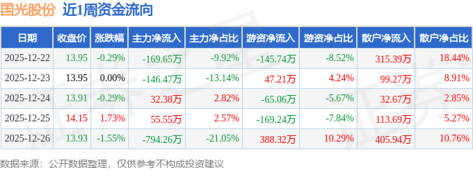 资金流向数据方面,本周国光股份主力资金合计净流出1022.45万元,游资资金合计净流入55.49万元,散户资金合计净流入966.96万元。本周资金流向一览见下表: