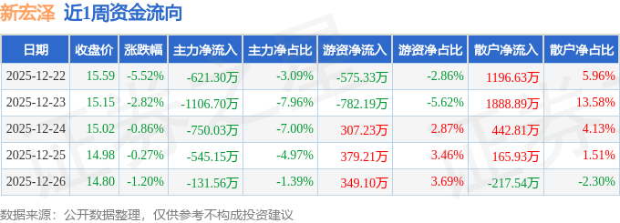 资金流向数据方面,本周新宏泽主力资金合计净流出3154.74万元,游资资金合计净流出321.98万元,散户资金合计净流入3476.72万元。本周资金流向一览见下表: