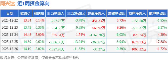 资金流向数据方面,本周同兴达主力资金合计净流出2350.77万元,游资资金合计净流出544.96万元,散户资金合计净流入2895.73万元。本周资金流向一览见下表: