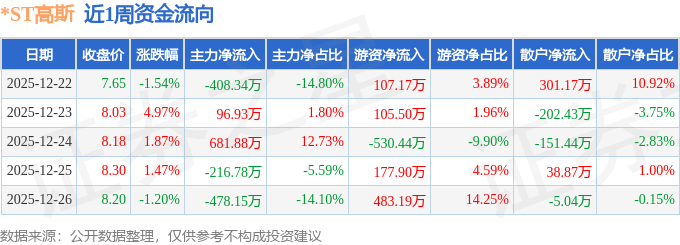 证券之星消息,截至2025年12月26日收盘,*ST高斯(002848)报收于8.2元,较上周的7.77元上涨5.53%。本周,*ST高斯12月26日盘中最高价报8.36元。12月22日盘中最低价报7.54元。*ST高斯当前最新总市值13.71亿元,在黑色家电板块市值排名10/10,在两市A股市值排名5167/5178。