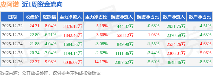 资金流向数据方面,本周皮阿诺主力资金合计净流入8376.16万元,游资资金合计净流出4265.63万元,散户资金合计净流出4110.52万元。本周资金流向一览见下表: