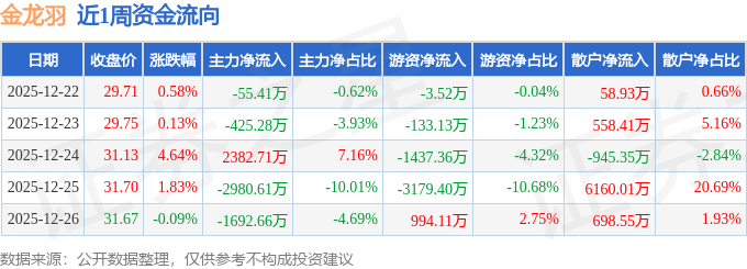 资金流向数据方面,本周金龙羽主力资金合计净流出2771.23万元,游资资金合计净流出3759.31万元,散户资金合计净流入6530.54万元。本周资金流向一览见下表:
