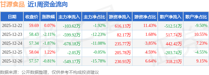 沪深股通持股方面,截止2025年12月26日收盘,甘源食品深股通持股数为95.46万股,占流通股比为192.0%。