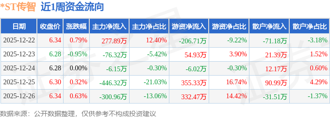 证券之星消息,截至2025年12月26日收盘,*ST传智(003032)报收于6.34元,较上周的6.29元上涨0.79%。本周,*ST传智12月22日盘中最高价报6.36元。12月23日盘中最低价报6.25元。*ST传智当前最新总市值25.52亿元,在教育板块市值排名15/16,在两市A股市值排名4833/5178。