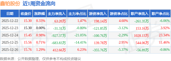 资金流向数据方面,本周鑫铂股份主力资金合计净流出1166.65万元,游资资金合计净流出240.46万元,散户资金合计净流入1407.11万元。本周资金流向一览见下表: