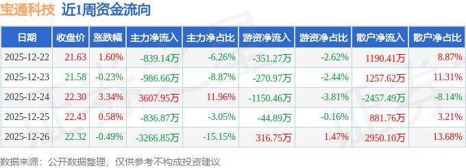 资金流向数据方面,本周宝通科技主力资金合计净流出2321.57万元,游资资金合计净流出1500.84万元,散户资金合计净流入3822.41万元。本周资金流向一览见下表: