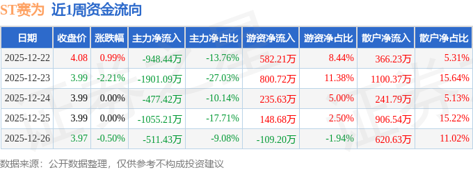 资金流向数据方面,本周ST赛为主力资金合计净流出4893.59万元,游资资金合计净流入1658.04万元,散户资金合计净流入3235.56万元。本周资金流向一览见下表: