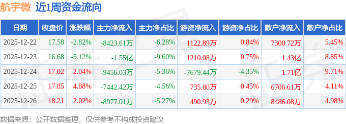 资金流向数据方面,本周航宇微主力资金合计净流出4.98亿元,游资资金合计净流出4119.74万元,散户资金合计净流入5.39亿元。本周资金流向一览见下表: