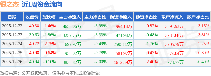 资金流向数据方面,本周银之杰主力资金合计净流出1.34亿元,游资资金合计净流入3180.95万元,散户资金合计净流入1.02亿元。本周资金流向一览见下表: