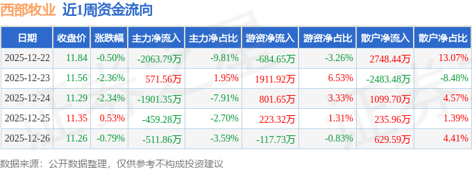 资金流向数据方面,本周西部牧业主力资金合计净流出4364.73万元,游资资金合计净流入2134.51万元,散户资金合计净流入2230.21万元。本周资金流向一览见下表: