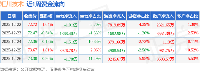 沪深股通持股方面,截止2025年12月26日收盘,汇川技术深股通持股数为5.48亿股,占流通股比为2416.0%。