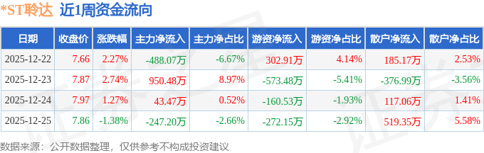 资金流向数据方面,本周*ST聆达主力资金合计净流入258.67万元,游资资金合计净流出703.26万元,散户资金合计净流入444.59万元。本周资金流向一览见下表: