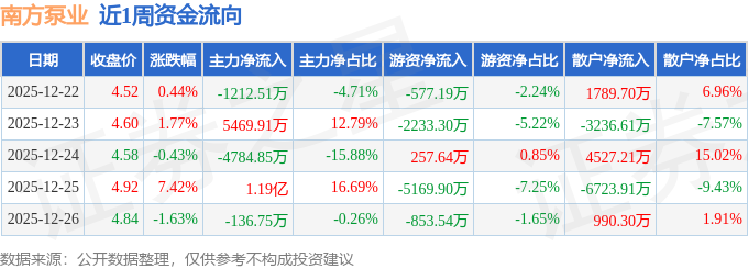 证券之星消息,截至2025年12月26日收盘,南方泵业(300145)报收于4.84元,较上周的4.5元上涨7.56%。本周,南方泵业12月25日盘中最高价报4.93元。12月22日盘中最低价报4.46元。南方泵业当前最新总市值92.97亿元,在通用设备板块市值排名44/217,在两市A股市值排名2038/5178。