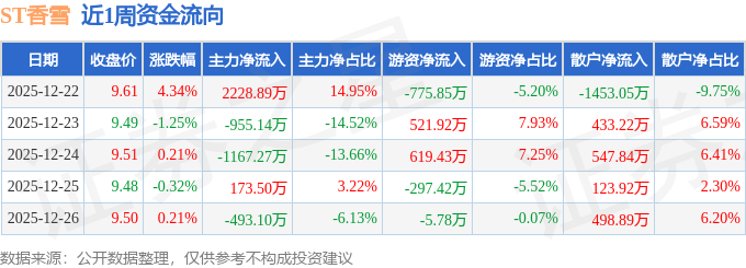 资金流向数据方面,本周ST香雪主力资金合计净流出213.13万元,游资资金合计净流入62.31万元,散户资金合计净流入150.82万元。本周资金流向一览见下表: