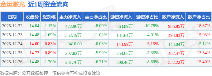 资金流向数据方面,本周金运激光主力资金合计净流出1225.67万元,游资资金合计净流出1106.65万元,散户资金合计净流入2332.32万元。本周资金流向一览见下表: