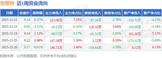 资金流向数据方面,本周宝莱特主力资金合计净流入385.17万元,游资资金合计净流出133.63万元,散户资金合计净流出251.54万元。本周资金流向一览见下表: