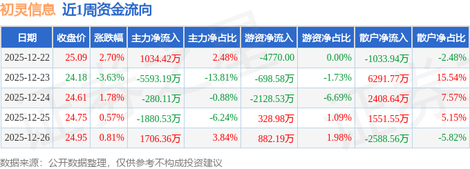 证券之星消息,截至2025年12月26日收盘,初灵信息(300250)报收于24.95元,较上周的24.43元上涨2.13%。本周,初灵信息12月26日盘中最高价报25.46元。12月23日盘中最低价报24.0元。初灵信息当前最新总市值53.33亿元,在IT服务板块市值排名81/119,在两市A股市值排名3196/5178。