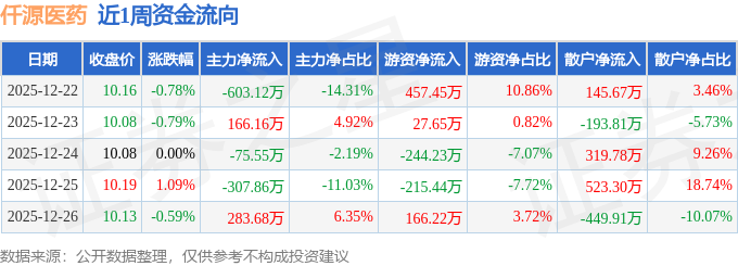 资金流向数据方面,本周仟源医药主力资金合计净流出536.68万元,游资资金合计净流入191.65万元,散户资金合计净流入345.03万元。本周资金流向一览见下表: